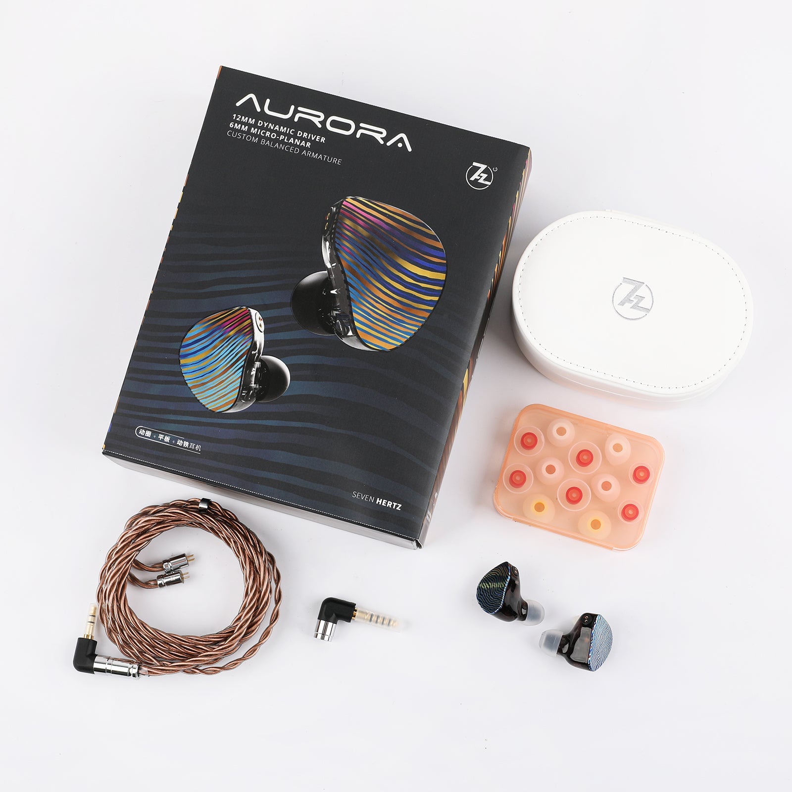 The Aurora utilizes a double dynamic driver system composed of 1 x 12mm large diaphragm drivers, 2x fullranged balanced armature drivers, and a 6mm ultra-treble planar driver. This design is significant for a few reasons. Firstly, by utilizing a multi-driver design, the frequency spectrum can be divided between multiple drivers, which reduces the driver load and increases output and sound quality. Second, by using a tribrid configuration, the most optimal sound characteristic can be achieved to bring out the best of each driver. One of the common faults of hybrid or tribrid designs are a mixing of timbre characteristics, which results in a disjointed sound. The Aurora addresses this by optimizing each driver type to respective frequency ranges at softer crossovers to create a coherent sound across the entire spectrum.