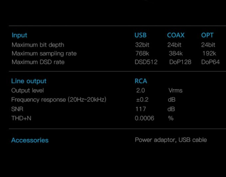 Actual measurements: noise: 2.96uV; THD+N: 0.0006%. Excellent specs is the basis of excellent sound