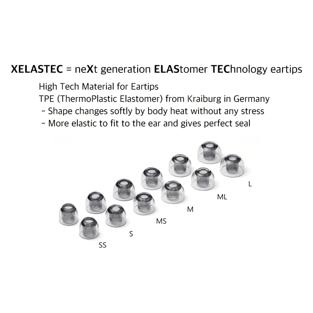 XELASTEC is new high tech material for music lovers, more elastic and fit your ear canal better. The shape of ear canal is not circular but an atypical ellipse. No one has the same shape of a ear canal, and even the left and right are different. SednaEarfit XELASTEC eartip shape changes softly by body heat after a few minutes to fit the various shape of the ear canal without any stress. SednaEarfit XELASTEC eartip absorbs body heat energy and getting more elastic property so it can fit better to the ear and gives perfect seal.
