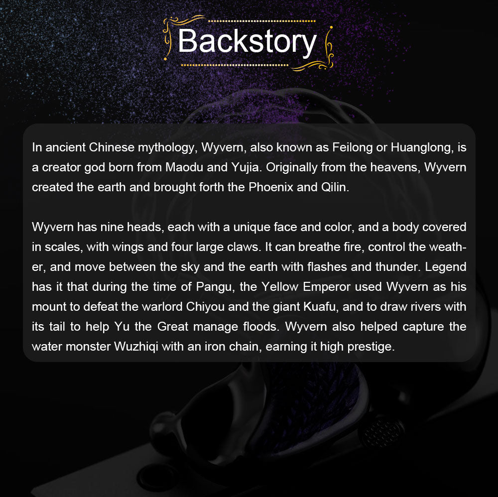 The Kinera Celest Wyvern Black draws inspiration from ancient Chinese mythology. Wyvern, also known as Feilong or Huanglong, is a creator god believed to have shaped the earth and brought forth mythical beings like the Phoenix and Qilin. With nine heads, wings, and the ability to control the elements, Wyvern is a symbol of power and mystery.
