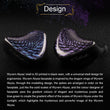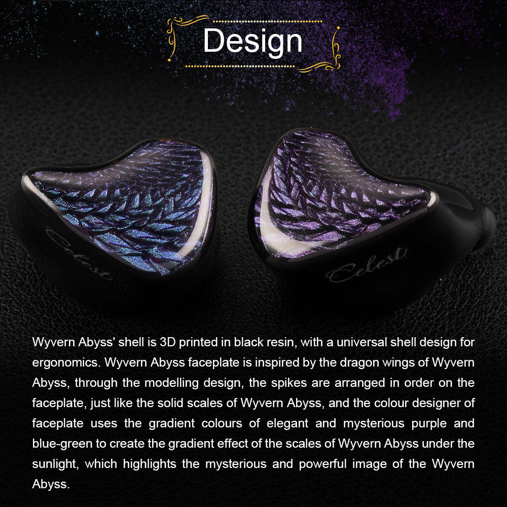 The Wyvern Black features a 3D-printed black resin shell with an ergonomic universal design. The faceplate, inspired by Wyvern's dragon wings, showcases orderly spikes resembling its solid scales. Gradient colors of elegant purple and blue-green create a shimmering effect, highlighting the earphones' mysterious and powerful image.