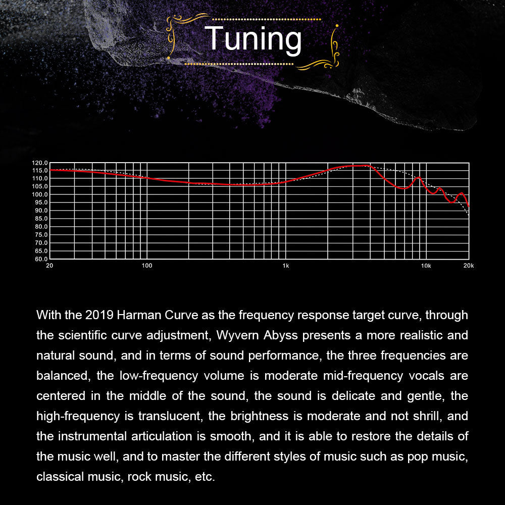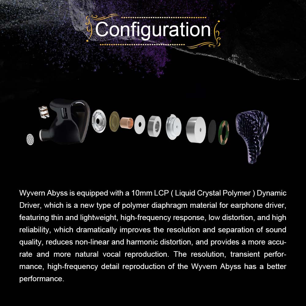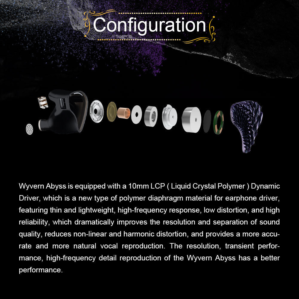 Equipped with a 10mm Liquid Crystal Polymer (LCP) Dynamic Driver, the Wyvern Abyss delivers high-resolution sound with low distortion. The LCP diaphragm ensures a high-frequency response and natural vocal reproduction. Following the 2019 Harman Curve, these earphones provide balanced sound across all frequencies, making them ideal for various music genres, from pop to classical to rock.