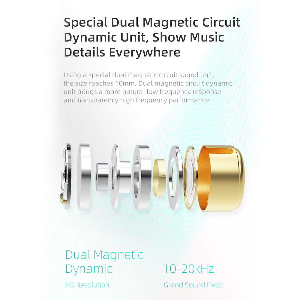 The advantage of the dual magnetic circuit dynamic is the solid and abundant magnetic, which provides shocking low-frequency sound effects, and the gentle and sweet vocals as if being in a concert scene. With mobile phone playback, there are also cinema-level sound effects. You can listen anytime and anywhere, no need to carry heavy professional players with you.
