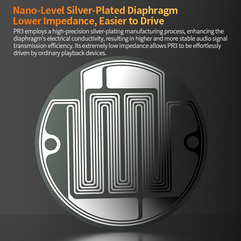 The high-precision silver-plating process enhances the diaphragm's electrical conductivity, ensuring higher and more stable audio signal transmission. With extremely low impedance, KZ PR3 effortlessly pairs with ordinary playback devices.