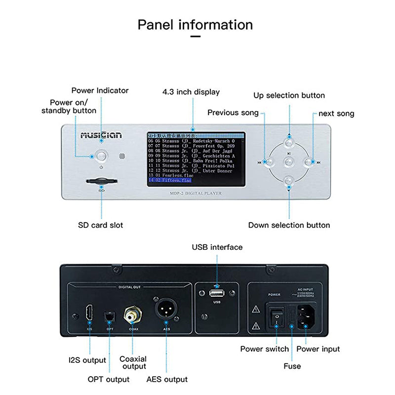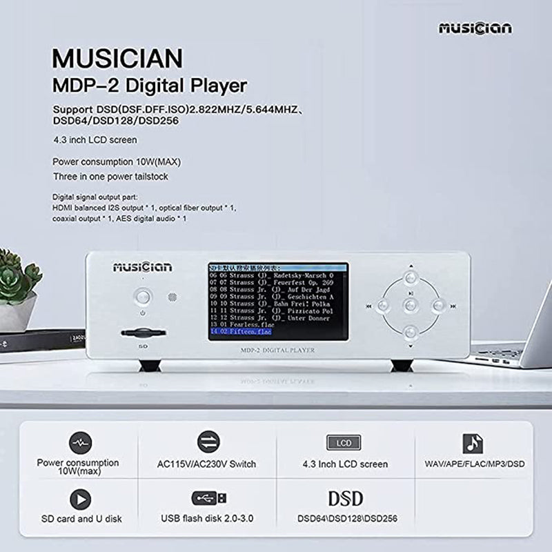 DP-2 Has HDMI balanced 12S output*1, optical output * 1, coaxial output*1, AES digital audio*1. Support play SD card and U disk.