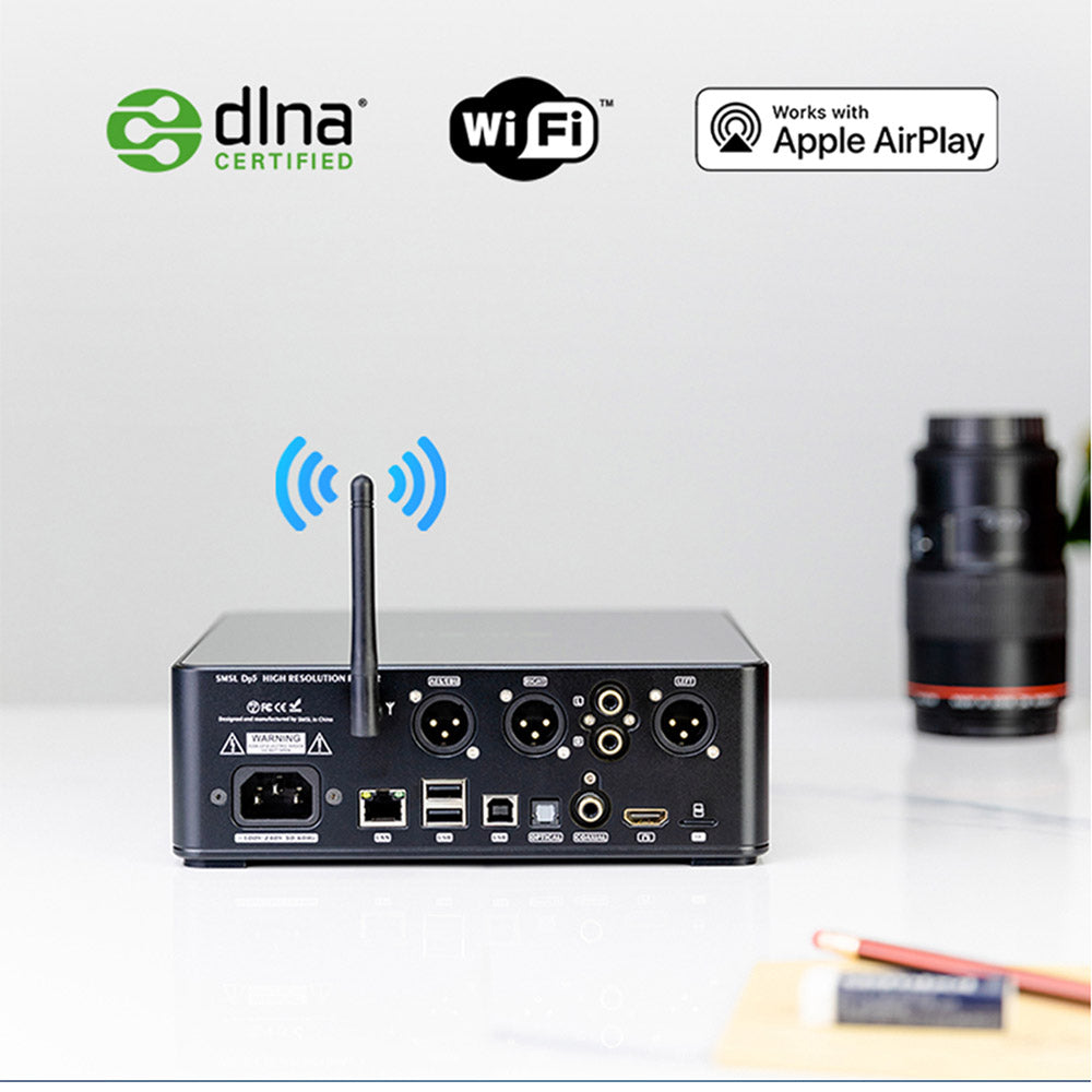 As a lossless player with headphone amplifier output, SMSL DP5 features a built-in ES9038PRO chip from an American ESS company. There are three key characteristics: high SNR, low distortion, and Native DSD support. It does support not only streaming playback, including DLNA and Airplay but also a 100M network interface and 2.4G/5G WIFI.