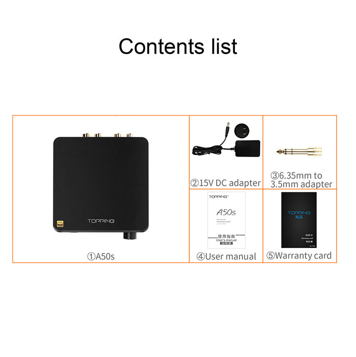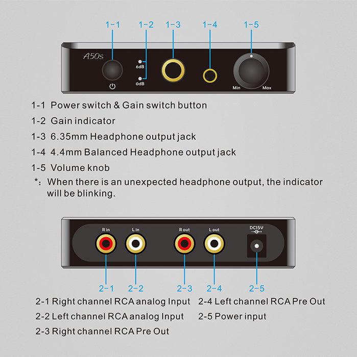 When the A50s is not connected to any headphones, it automatically works in the pre-amplifier mode, and the amplified signal is output from the RCA on the back panel. When the headphone is connected to 6.35mm or 4 .4mm output, A50s automatically switches to the headphone amp mode, and the signal is only output to the 6.35mmand 4.4mm jack.
