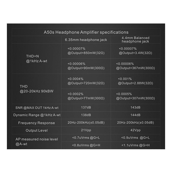 A50s is equipped with two gain settings of 0dB/6dB at SE output(6dB/12dB at balanced output). Wide range of gain settings and the 0.3uVrms ultra-low noise makes A50s easily adapt to all types of headphones from extremely sensitive IEMs to most power demanding full-sized over-ears.